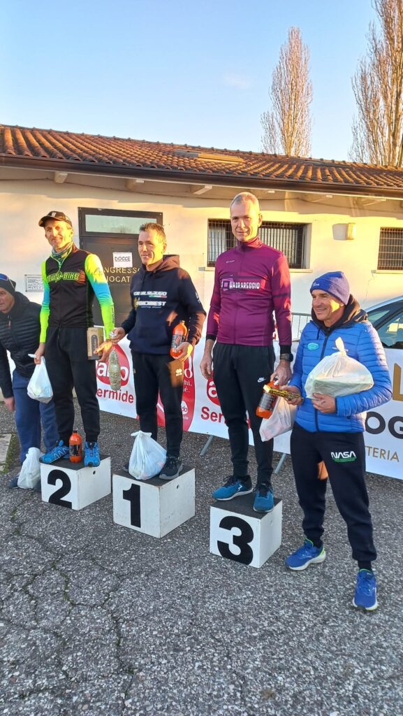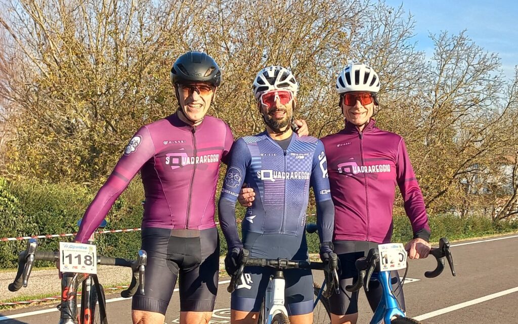 A Varese questo sabato e domenica si sono svolti i Mondiali Master UCI di Ciclocross quindi visto la concomitanza il Trofeo Modenese ha osservato giustamente una giornata di riposo per permettere ai tesserati FCI di partecipare, noi tesserati ACSI non avremmo comunque potuto ma in giro di gare c’e nè sono e questa organizzata dai Cicloamatori Castelmassa giunta alla 19° edizione in memoria di “ICIO” Bocchi loro compagno scomparso visto la distanza da Reggio non proibitiva non ce la siamo fatta scappare. E’ una gara storica che negli ultimi anni ha migliorato nettamente il disegno del percorso gara rendendolo un vero ciclocross, con i suoi su e giu’ per gli argini golenali del Po i Castelmassa hanno tirato fuori un campo gara veramente accattivante e da lingua fuori … con i suoi 250 mt di dislivello totale non c’era un tratto dove poter riprender fiato, i nostri tre se ne son accorti subito nei due giri di prova prima del via ufficiale … ci sarà da sputare la pallina. Una quarantina i presenti divisi in due partenze di quasi un minuto una dall’altra con Elite, M1, M2, M3, M4 e M5 davanti ed a seguire M6, M7, M8, M9 e Donne. Ai blocchi di partenza ci siamo accorti subito che il lotto era di un certo riguardo con diversi nomi noti che spesso troviamo sui primi gradini del podio non solo al Modenese ma anche a campionati lombardo/veneti sinonimo di gara dura … non era forse quello che cercavamo per fare un buon allenamento in vista delle ultime due del Trofeo Modenese ? Complimenti ai nostri tre che alla fine son riusciti a mettere tutti i piedi sul podio, nella M6 vinta dal fortissimo veneto Daniele Lissandrin il nostro Rossano (16° assoluto e 3° M6) ha a lungo sbattagliato con Portioli per il secondo gradino del podio che ha dovuto cedere per colpa di un’errorino e forte troppa generosità visto che ha quasi sempre condotto in prima persona la battaglia; Luca (20 assoluto e 3° M3) causa una caduta ha perso le ruote del gruppetto in cui era ma Nicola Braggio 2° assoluto e vincitore della sua gara era da impresa impossibile, troppo forte, ma Luca si è sicuramente divertito ed il piazzamento è di tutto riguardo; bene anche “capitan Giaroli” (23° assoluto e 1° M8) che qui praticamente senza avversarsi si è divertito a prendere diversi concorrenti della prima partenza . Bene prossimo appuntamento l’ 8 dicembre con la new-entry del Trofeo , la gara di Pavullo nel Frignano … alè Squadrareggio.