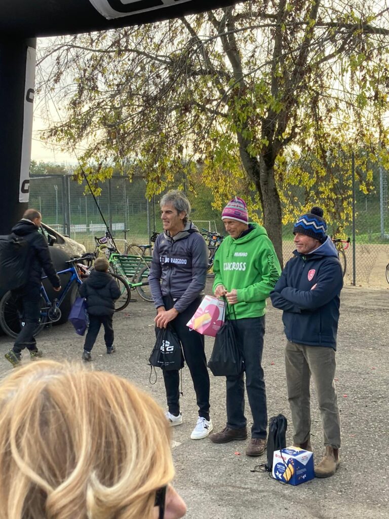 Veniamo a noi, Marco primo a partire come sempre deve lasciare andare Mimmo Toni (Campione Italiano Uisp) troppo forte il ritmo imposto dallo Iaccobike e si fa due giri in seconda posizione per poi perderla in un punto tecnico a favore dell’amico Giorgio Goldoni/TeamVirginia molto bravo nella guida nel tecnico e soprattutto nelle curve, la gara sembra andata perchè nel pratone il Virginia sembra divorare le curve, ma mai mollare … a metà del penultimo giro “il capitano” decide che non puo’ finire così e nei tratti a lui piu’ favorevoli comincia a buttare giu’ dei denti e si riporta sotto per poi sferrare l’attacco finale sul salitone in asfalto passando a doppia velocità l’amico Goldoni e mettendo in banca l’ennesimo 2° posto dell’annata. Nella M5 come sempre ostica e imbottita di campioni Roberto ha poco gioco ma abbiamo imparato a conoscerlo è uno che non ci molla e la porta sempre a casa e con onore in 15^ conscio che la concorrenza è di quelle impossibili e che l’importante alla fine è … divertirsi. Altro discorso è quello di Luca che dopo aver provato in mtb la gara di Reggio è rimasto ammaliato guardando quel giorno quella di ciclocross e allora perchè non provare quello che potrebbe essere un’amore a prima vista ? Detto fatto, si presenta a questa che come prima sicuramente non è tra le piu’ semplici in sella al destriero preso in prestito dal buon Buzzelli , salire e scendere dalla bici e affrontare ostacoli e scalinate per uno che comincia non è dei piu’ semplici ma giro dopo giro comincia ad ingranare e prende dimestichezza, purtroppo incappa anche in un capitombolo ma quello è uno dei prezzi da pagare col noviziato, chi non cade la prima volta? qui è come togliere le rotelline della prima biciclettina, comunque nonostante nel sua M3 ci siano almeno i primi cinque intoccabili come esordio Luca ci regala un’ottimo e lusinghiero 8° posto e lo troviamo all’arrivo stanco ma sorridente come un bambino che ha scoperto un nuovo giocattolo … attento Luca il ciclocross crea dipendenza . Ecco i vincitori di giornata : Woman Giulia Ballestri/ EmilianaBike; M1 Nicolas Lanfredi/CheroGroup; M2 Paolo Ragozzino/La BottegaCasinalbo; M3 Luca Piazza/FBR-ElpoBike; M4 Francesco Corradini/CicliPengo; M5 Eros Negrini/ProCycling; M6 Stefano Nicoletti/EmilianaBike; M7 Bruno Spadoni/NMB; M8 Mimmo Toni/Iaccobike.