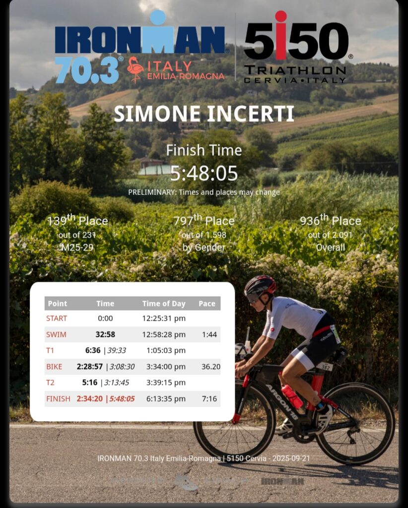 Con i suoi oltre 6000 atleti, nel weekend di IRONMAN Italy Emilia-Romagna, Cervia diventa il caleidoscopio più colorato e imprevedibile del triathlon mondiale, che ormai pensa a questo centro della riviera romagnola come una delle capitali di fatto dello sport delle tre discipline. Non è solo una questione di numeri, non è “soltanto” l’IRONMAN più grande al mondo con i suoi tre format – IRONMAN, IRONMAN 70.3 e 5150 – ma un evento a cui i partecipanti da più di 80 Nazioni associano un significato particolare. Non sono mancati in questo evento i nostri e le nostre portacolori di Squadrareggio: Lorenzo Melotti, Alberto Margini, Beppe Ragni si sono misurati con 51.50 (distanza olimpica) mentre Manuela Beltrami, Alex Montanari e Simone Incerti si sono misurati con 70.3 (mezzo Ironman). Una sfida che hanno saputo cogliere, che hanno portato fino alla fine per poter dire, o meglio gridare con gioia: “I AM A FINISHER“. nota del redattore: una menzione speciale tengo a farla per il nostro Alberto (detto il Gigi) che fino ad un anno fa non sapeva nemmeno nuotare e dopo aver superato un problema di salute (con il cuore non si scherza!), con costanza e dedizione si è posto questo traguardo incredibile ed è riuscito nell’impresa! Grandissimo Gigi, tanta stima!