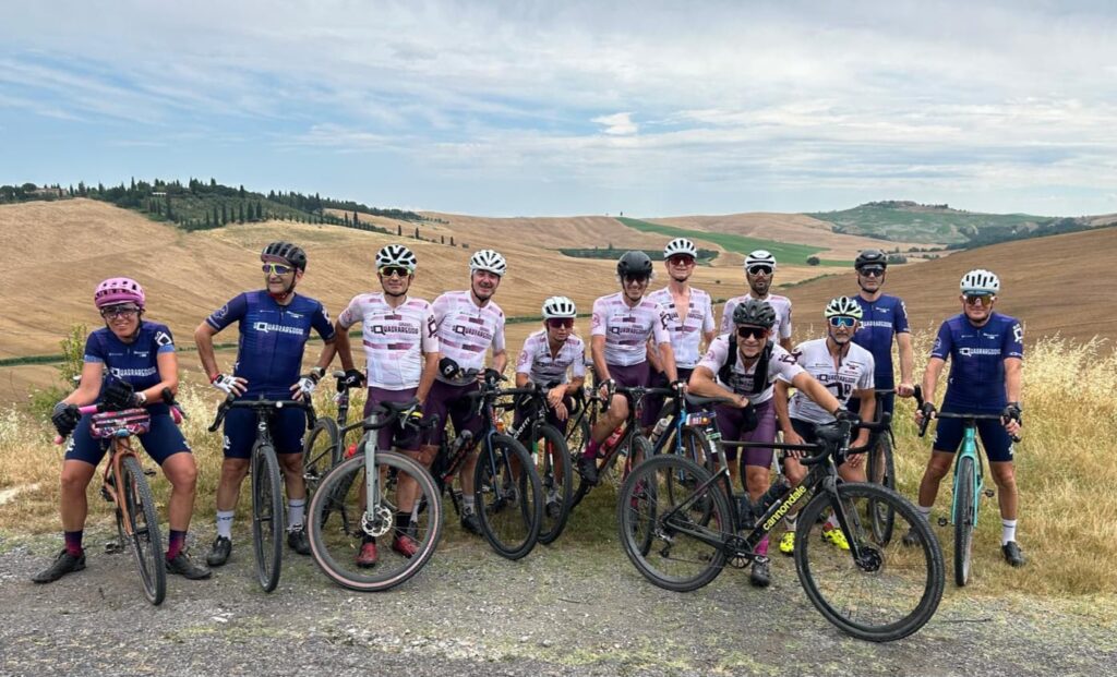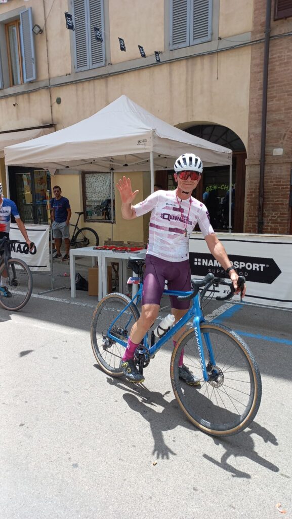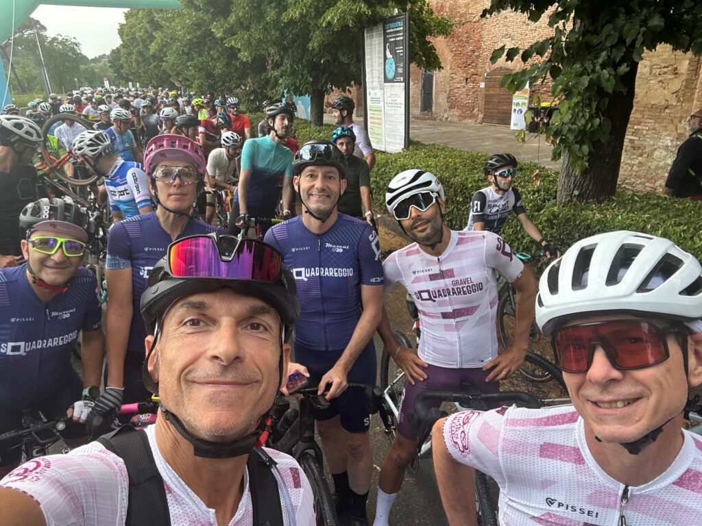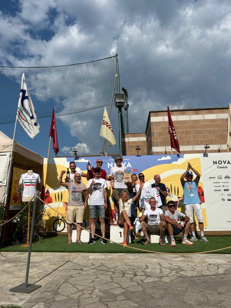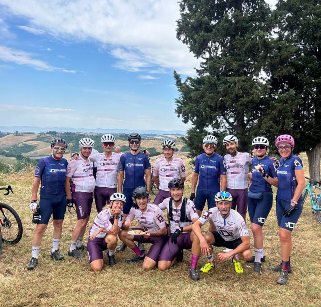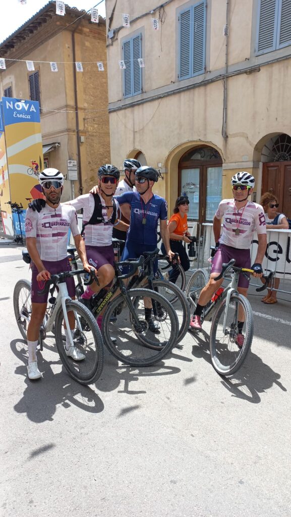 BUONCONVENTO – Ebbene si, l’abbiam fatto di nuovo … vero sì che si scendeva a Buonconvento con intenzioni bellicose ma una pioggia di risultati così non erano sicuramente nei pensieri di tutti, per non parlare poi della ciliegina finale sulla torta… e che bellissima ciliegina la Vittoria come 1^ Società Classificata a coronamento di una giornata Top tra amici. La Nova Eroica come dice il suo ideatore, Giancarlo Brocci, è un format unico nel suo genere di gara in perfetto equilibrio tra agonismo e convivialità che celebra la bellezza delle Strade Bianche, ma soprattutto il gusto della sfida ed il divertimento di pedalare in compagnia, tra l’altro e qui lo dico io perchè non esserci è anche Campionato Nazionale Acsi Gravel … what else ! Nova eroica presenta quattro percorsi ormai storici e collaudati due non competitivi da 40 e 60 km e due agonistici il Medio 90 ( 97.5 km x 1.400D+) ed il Lungo 130 (131 km x 2.000 D+), su questi ultimi due nelle annate cambiano solo le prove cronometrate che variano di anno in anno. Ed eccoci alle note salienti: la sveglia della domenica ci viene data da Giove Pluvio che a suon di tuoni e fulmini alle 5.00 precise ci da’ il benvenuto scaricando tra le 6.00 e le 7.00 una bella valanga d’acqua, poco male la partenza delle 8.00 sarà al fresco e non sotto il caldo opprimente dei giorni precedenti ma soprattutto non ci sarà il solito polverone in gara. 13 le maglie Squadrareggio ai blocchi di partenza pronti per una giornata da gustare tra sfida e divertimento sotto il motto di Brocci, un breve tratto d’asfalto per arrivare all’ inizio della prima strada bianca e dopo poco piu’ di 6 km eccoci a Serravalle con il primo tratto cronometrato Serravalle-Monteroni d’Arbia, 9 km da fare pancia a terra o quasi perchè i primi 2,5 km sono in salita ed il resto un bel vallonato da passistoni, ci si raggruppa prima di affrontare dopo pochi chilometri il secondo tratto la Asciano-Asciano, 5,4 km subito belli veloci ma con sorpresa sul finale … uno strappo durissimo di 250 mt che chi ha gambe ma soprattutto rapporti adatti riuscirà a superare in bici per gli altri il piede a terra e bici in spinta sarà d’obbligo. Al termine di questo tratto un mega ristoro ottimo per recuperare lo sforzo attende i partecipanti, non facciamo nomi ma qui si è visto qualcuno di noi sbafare una pappa al pomodoro o chi uno stufato di pecora conditi a chianti …, ma chi sarà stato ? si continua con altro tratto di strada bianca velenosissimo che da Ponte del Garbo ci porterà a scalare il famosissimo e tanto caro ad un certo “Spartacus” Cancellara Monte Sante Marie, la scalata da lingua fuori ci porta all’asfalto di Castelnuovo della Bernardenga, una decina di su e giu’ costeggiando le Crete Senesi su asfalto con rampe belle dure, poi in località Vescona di nuovo lo splendore delle strade bianche che ci riportano al ristoro di Monteroni, ci si rifocilla accompagnati da un’orchestra e si rimonta in bici per affrontare subito su asfalto tratti al 15% e di nuovo ghiaia dove anche qui le rampe replicano quella pendenza. Riprendiamo a Radi un breve tratto d’asfalto che ci porta a Murlo dove abbiamo alloggiato la sera prima, un bel discesone ci accompagna alla divisione percorsi (Km 88) , qui “capitan Giaroli” colpito in settimana da virus gastrointestinale decide che per lui è forse meglio chiuderla con il Medio mentre il resto della truppa prosegue per il Lungo. Per Marco altri 9 km di ghiaia e 500 mt di asfalto per chiuderla a Buonconvento dove scopre che nonostante la gamba vuota per il virus nelle prime due cronometrate non e proprio andato poi così male finendo in 2^ posizione di M8 (30° assoluto su 534 classificati) ma vede sfumare la maglia tricolore qui vinta sul lungo due anni fa per un misero minuto, perso sicuramente sullo strappo durissimo che colpa di rapporti adatti del suo mezzo sì al ciclocross ma non al gravel deve fare a piedi (alla fine del primo tratto il miglior crono era dalla sua)… ma và benissimo dopo le vicissitudini di questo 2025 è come una vittoria. Per i nostri sul Lungo il sole si ripresenta e le nuvole che ci hanno tenuto al fresco se ne vanno, il caldo si aggiunge alla durezza della prova, dopo il bivio dei percorsi una bella quindicina di km di ghiaia li porta ad affrontare il terzo tratto cronometrato Montalcino-Montalcino (4,6 km) che unisce due bei tratti in salita a tratti in costa vallonati, all’uscita il ristoro di Torrenieri buono per ricaricare energie e liquidi, poi pochi chilometri d’asfalto per attaccare il quarto ed ultimo tratto crono San Giovanni d’Asso – Pieve a Salti (7,5 Km) con inizio in salita ed il resto piu’ semplice… è fatta, una bella discesa su asfalto e anche per loro c’è l’arrivo di Buonconvento tra gli applausi. Doccia per tutti , pasta-party ed ecco esposti anche i risultati del Lungo (217 classificati) e che risultati …