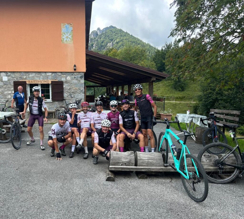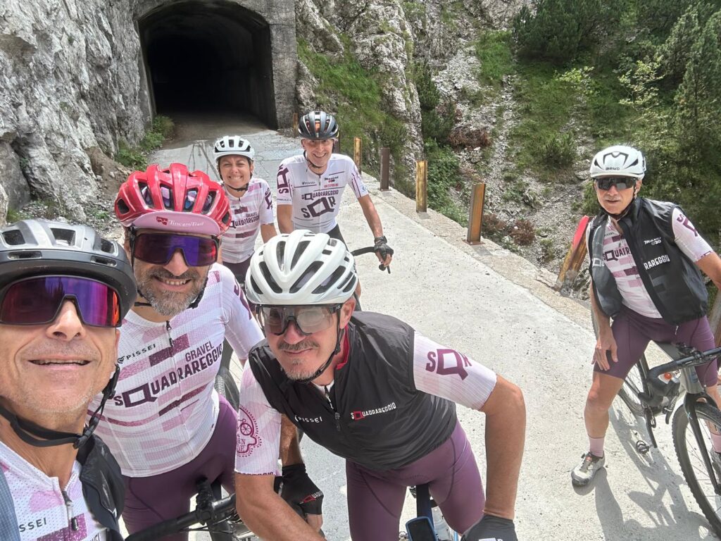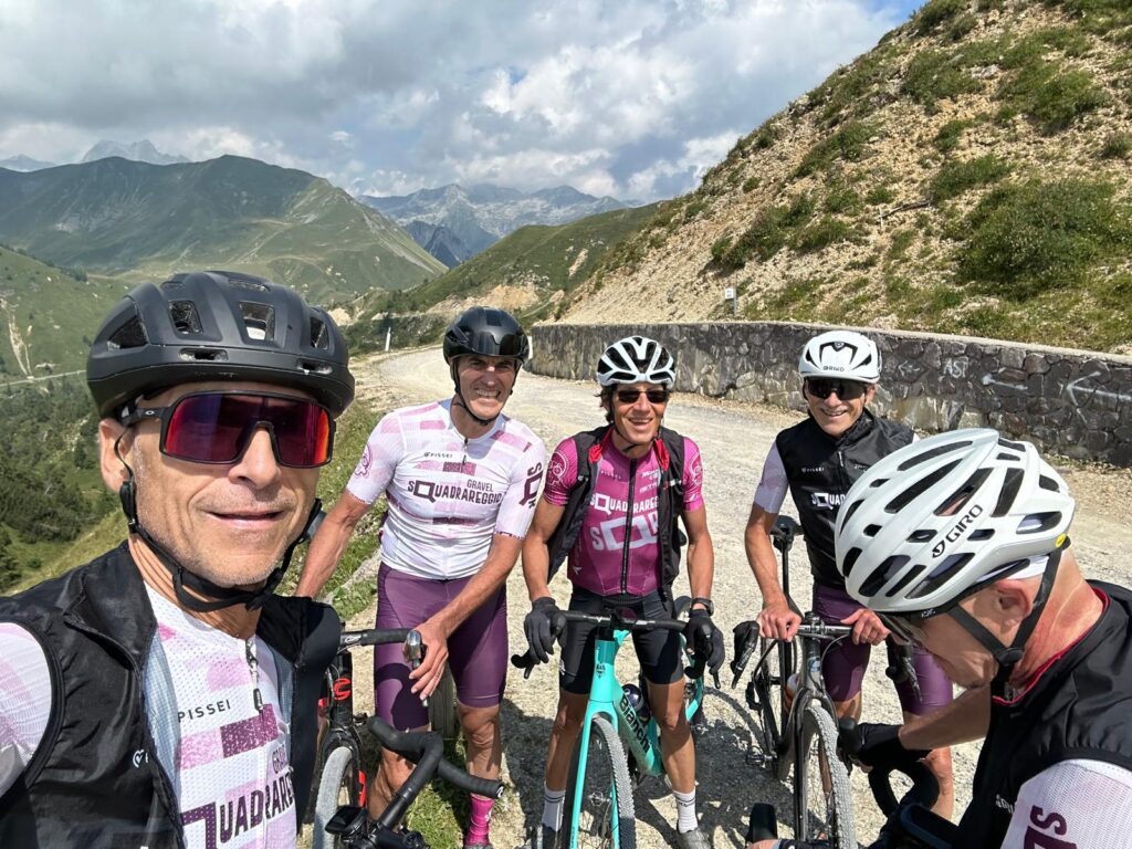 Otto Squadrareggio in fuga dalla Pianura Padana vanno a caccia di fresco e salite. Tutti in auto direzione Brescia e Lago d’Idro dove ci aspetta il punto zero della partenza in bici alla piccola frazione di Vesta dove ci attende il nono di noi Carlo Catellani che ha un cottege proprio in riva al lago e da bravo ed esperto conoscitore dei luoghi ci farà da guida. Alle 10.30 Carlotta Giovanardi, Filippo Codeluppi, Andrea Foletti, Carlo Buzzelli, Stefano Spagni, Stefano Peterlini , Fausto Fornaciari e Marco Giaroli sono pronti sulle loro Gravel, vestiti di tutto punto belli carichi con Carlo al comando per l’impresa odierna. Si parte sulla bella ciclabile che costeggia il lago fino ad arrivare ad Anfo dove lasciamo i 325 mt di altezza dell’Idro per la prima asperità di giornata, il Passo Baremone tutto in asfalto con i suoi 12,6 km di lunghezza e 1.450 mt di altezza ( 1.125 mt di dislivello all’ 8,8% di pendenza media ), arrivati in vista del Rifugio Rosa la pendenza diminuisce e dopo una breve sosta rigenerante riprendiamo in leggera salita fino al Passo Spina, poi brevissima discesa che ci porta al Passo della Berga. Per raggiungere invece il Passo Dosso Alto c’è da affrontare uno strappo impegnativo, ad un tornante ci fermiamo, sotto di noi un paesaggio da cartolina, peccato che sia offuscato da nuvole basse. Poco dopo la strada diventa ghiaiata con una sequenza di strapiombi con vista sulla Val Trompia, ottima per testare le nostre Gravel. Finito l’impegnativo tratto in ghiaia in lontananza vediamo il Passo Maniva, dopo una breve discesa un attimo di sosta al Dosso Alto quota 1.664 mt per rifiatare prima di affrontare su asfalto i 9 km che ci porteranno ai 2.136 mt del Giogo della Bala, i primi 4 km sono belli impegnativi ma anche i restanti 5 si fanno dare del lei. Nuovamente una breve sosta per ricompattarci ed affrontare la strada che diventa nuovamente ghiaiata e comincia la parte piu’ panoramica del giro. Piccoli specchi d’acqua circondati da vegetazione alpina, cascine e malghe, animali al pascolo su praterie verdissime, in lontananza una miriade di vette ci appaiono e scompaiono tra le nuvole il tutto a far da splendido contorno a questo incredibile paesaggio. Arrivati al Passo Crocedomini finisce la ghiaia e gli sterrati e con loro anche la parte forse piu’ bella del giro che qui celebriamo finalmente al sole con piedi sotto al tavolo brindando a birra con un bel panino prosciutto e formaggio sotto i denti per poi chiudere con strudel e crostate. Finito il ristoro si rimonta in sella prima in leggera salita, poi tutta discesa passando prima Gaver per poi raggiungere Bagolino, patria del Bagos, ed eccoci di nuovo in riva all’Idro sul bel percorso in ghiaino che costeggia il lago e ci riporterà a Vesta dove i padroni di casa , la gentilissima e splendida famiglia Catellani ci ha riservato una sorpresa, per tutti selezione di formaggi tipici della zona con in testa il bagos, salame casalino, pane e birra a fiumi e chiusura da urlo con due torte delle Rose. I 95 km del giro con i suoi 2.250 mt di dislivello totale sono stati sicuramente belli impegnativi ma paesaggi incantevoli e compagnia impagabile hanno fatto si che questa giornata Squadrareggio rimarrà negli annali e nelle memorie chi chi l’ha vissuta, grazie a Carlo in primis per averci fatto da guida e per l’ospitalità hors categorie ed a chi oggi ha voluto esserci e poi un sentito grazie a SQR … what else !